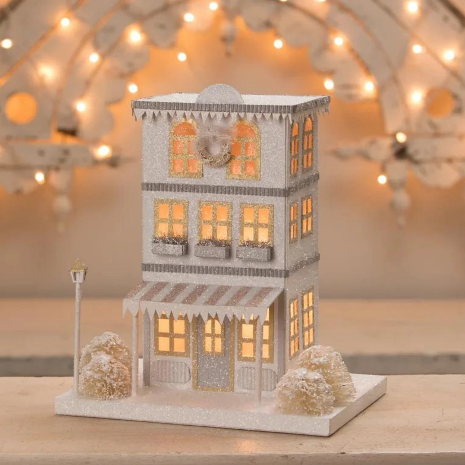 Make a statement on your mantle this holiday with these stunning Christmas buildings! Each one is covered in white glitter with silver and gold glitters accents and decorated with bottle brush trees and wreaths with tiny bows! Choose between a spectacular storefront shoppe, a terrific townhouse, a cute church, or a cozy cottage home! Light up the buildings with a C7 light cord. Light cord is NOT INCLUDED. Made by Bethany Lowe. Dimensions: Storefront Shoppe LC1565- 11″ x 8″ x 13″, Townhouse LC1566- 11″ x 8″ x 14″, Church LC1564- 11.25″ x 8″ x 16″, and Cottage Home LC1567- 11″ x 8″ x 13″. Made of pressed paper, bottle brush, glitter, and fabric trims. Item #: LC1565, LC1566, LC1564, and LC1567. Each item sold individually.
