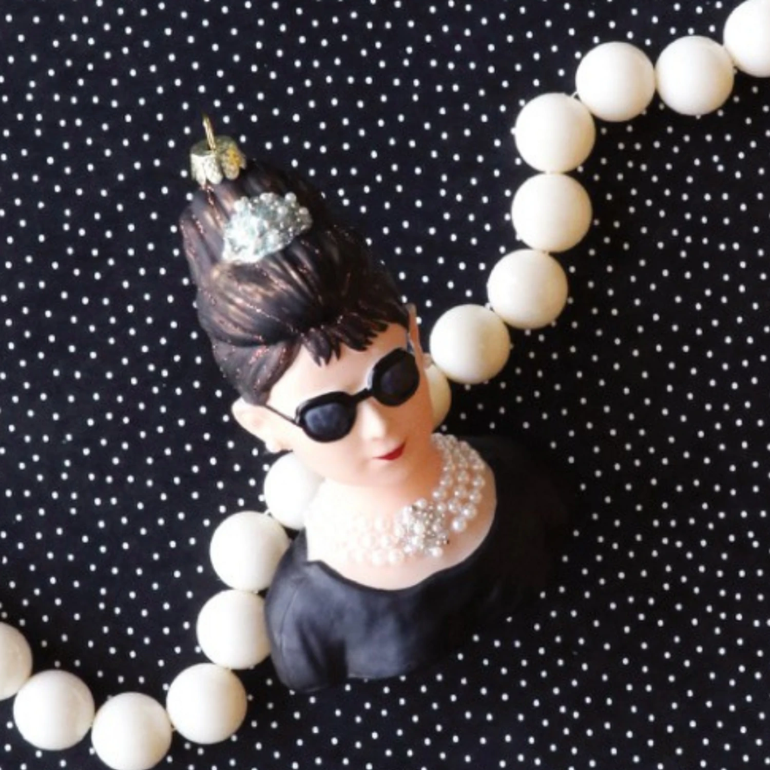 Are you a classic film lover?? Then we know you’ll love this ornament! It features Audrey Hepburn in her iconic black dress with matching black sunglasses and ornate necklace laying across her chest! Her hair is pinne4d up in her signature up-do and accented with a pearl tiara! Made by Cody Foster. Made of glass. Dimensions: 5.25″. Item #: GO-6732