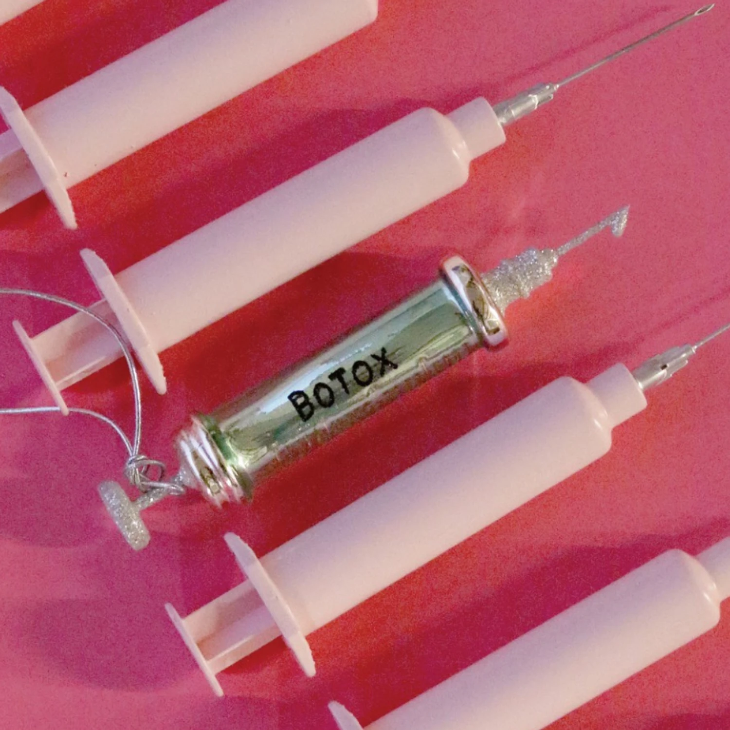 Sometimes we like to do a lil something extra to reduce the look of our inevitable aging- botox! This would make a lovely gift for an esthetic nurse or a friend who loves her R&R botox trips! It features a light blue and silver syringe with a silver glittered needle! Made by Cody Foster. Made of glass. Dimensions: 5″. Item #: GO-6950