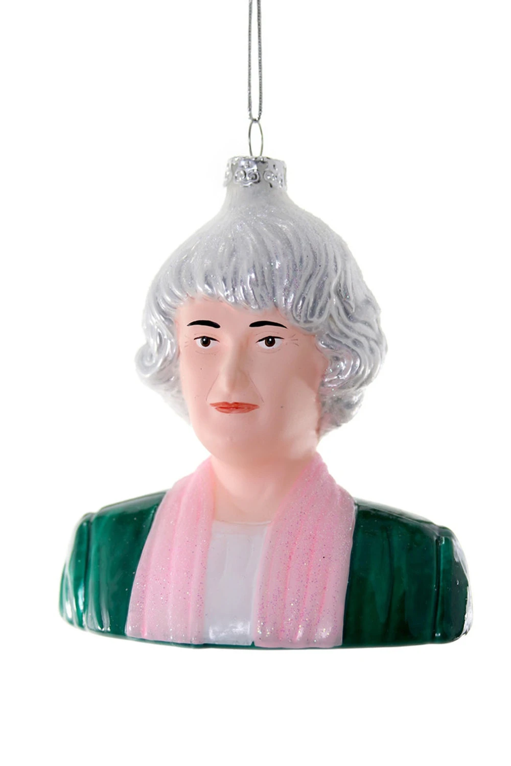 Thank you for being a friend! We all grew up watching the beloved Golden Girls and their shenanigans! This set features Rose in a puffy sleeves purple shirt and neatly curled hair, Sophia in a pink shirt and dark pink cardigan with a pair of thick rimmed glasses, Dorothy in a green jacket with a pink scarf, and Blanche in a sparkling gold blazer and her brown hair swept to the side! This would make a perfect gift for your bestie this year! Sold as a set of 4. Made by Cody Foster. Dimensions: each ornament is 4″. Item #: GO-6656-GG