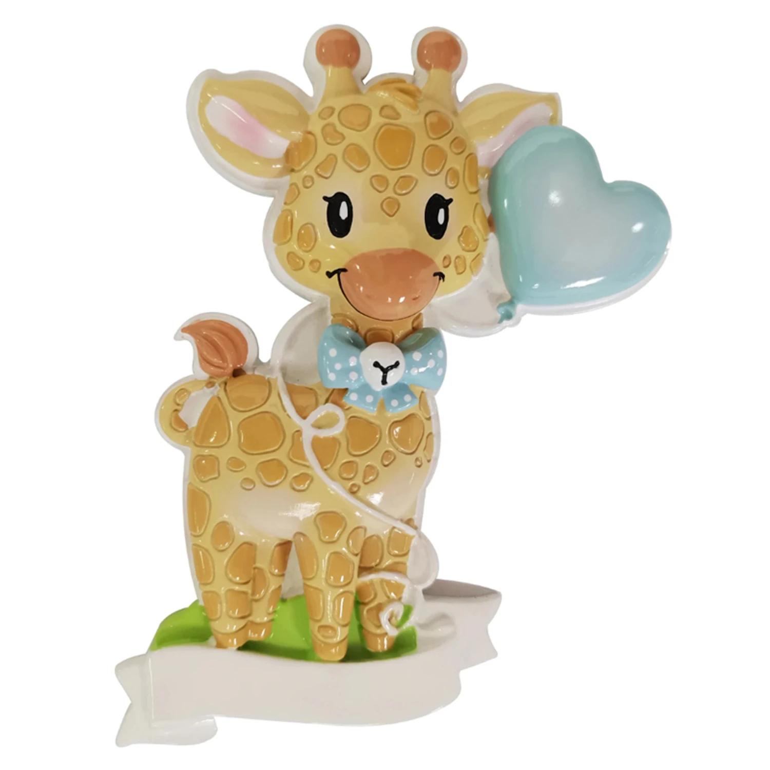 This cute little giraffe is a beautiful yellow color with tiny brown spots And a smiling face! He has a light blue heart shaped balloon and a matching blue bowtie! Get your little’s name and the year written on the ornament for a fun keepsake! Made of resin. Item #: OR2236-M