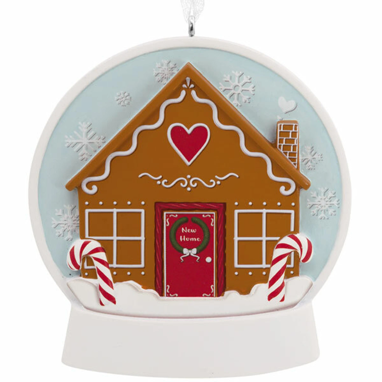 Celebrate your new home with this adorable ornament! It features a beautiful gingerbread house with a red door decorated with a wreath that reads “New Home” inside of a snow globe dome! Get your new address and the date written on the base below! Made by Hallmark. Made of resin. Dimensions: 3.68” x 2.66” x 0.74”. Item #: 1HGO2930