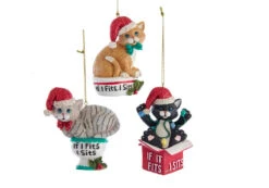 We all know our beloved feline friends love to squeeze themselves into small, cozy spaces. Choose a bright orange cat in a food bowl, a grey cat in a cup, or a black cat in a box! Each one wears a Santa hat! This would make the perfect gift for the cat lovers on your list! Made by Kurt Adler. Made of resin. Dimensions: 3.25″. Item #: E0599