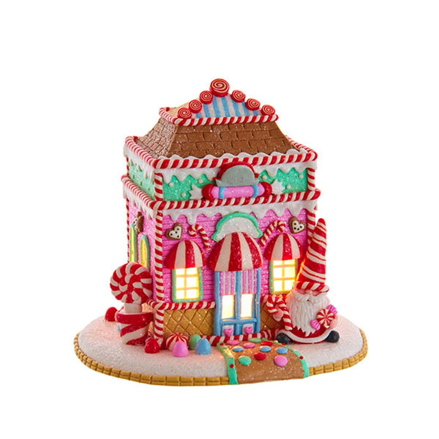 These stunning gingerbread shops feature bright colors of pink, blue, green, and purple decorating brown cookie walls and white icing details! Each house is dotted with colorful candies and has a theme like peppermint candies, doughnuts, or ice cream with a matching gnome out front! Plug in figure. Each sold individually. Made by Kurt Adler. Made of claydough. Dimensions: 7.5″ tall. Item #: GBJ0028