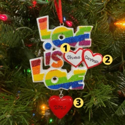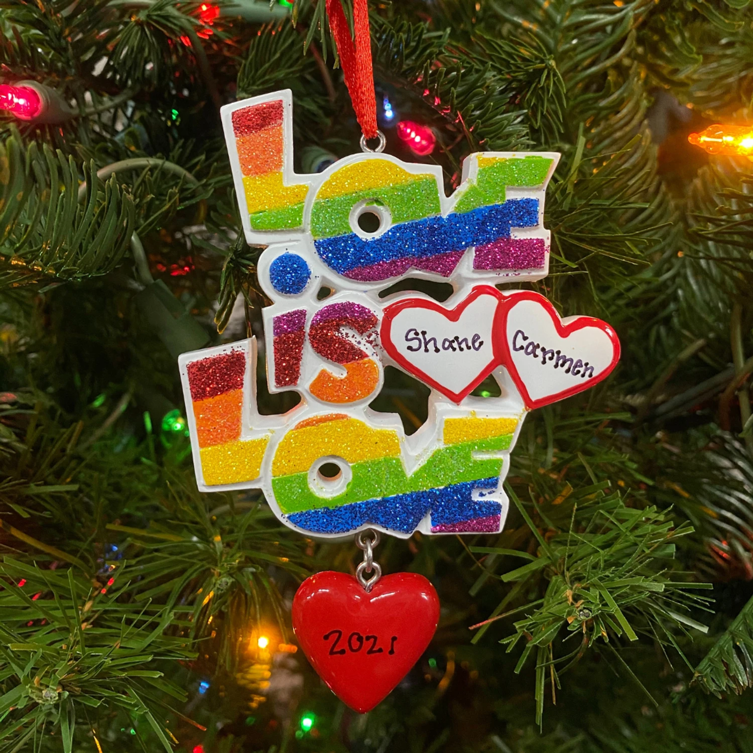 Love is Love! This adorable ornament is perfect to hang on your Christmas tree and be PROUD of who you are! It features the words “Love Is Love” in rainbow glitter with two small hearts to write names and a red heart dangling below to write the year! Made of resin. Dimensions: 3.25″ x 4.5″. Item #: OR1455