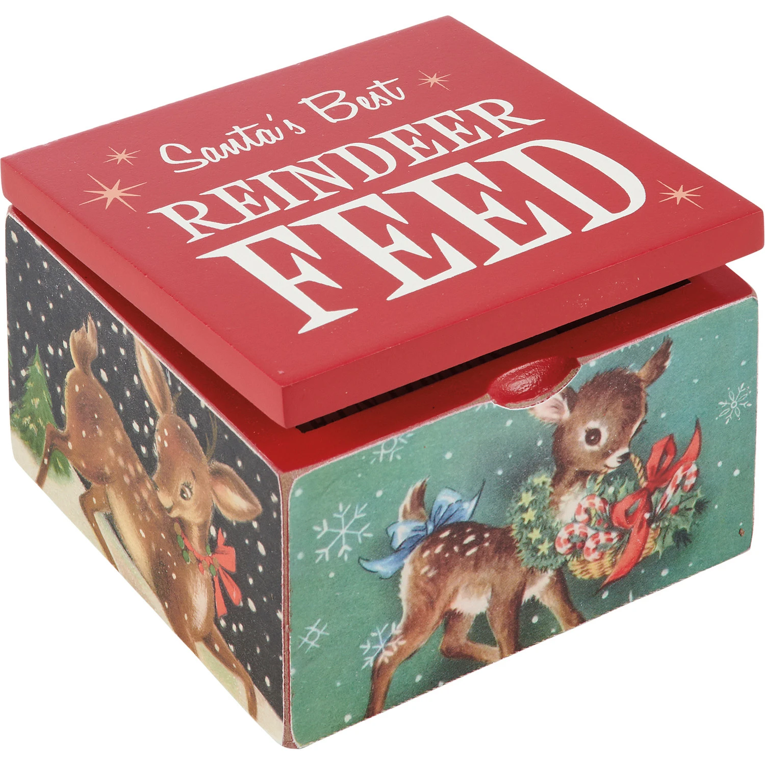 Even Santa’s reindeer need a special treat on Christmas Eve! This box features a hinged top with a secret hidden inside! Each side of the box has a vintage reindeer design and the top reads “Santa’s Best Reindeer Feed” in a fancy retro font! When you open the box a bag of red glitter reindeer feed reveals itself! Made by Primitives By Kathy. Made of wood. Dimensions: 4″ x 4″ x 2.75″. Item #: 115353