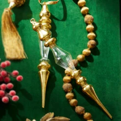 Have your tree dripping in elegance and gold with these ornaments! Each one features a long and thin gold finial with a clear piece in the center! Each sold individually OR purchase as a set. Made by Raz Imports. Made of glass. Dimensions: 1.25″D X 11″H; 1.5″D X 11″H. Item #: 4320868