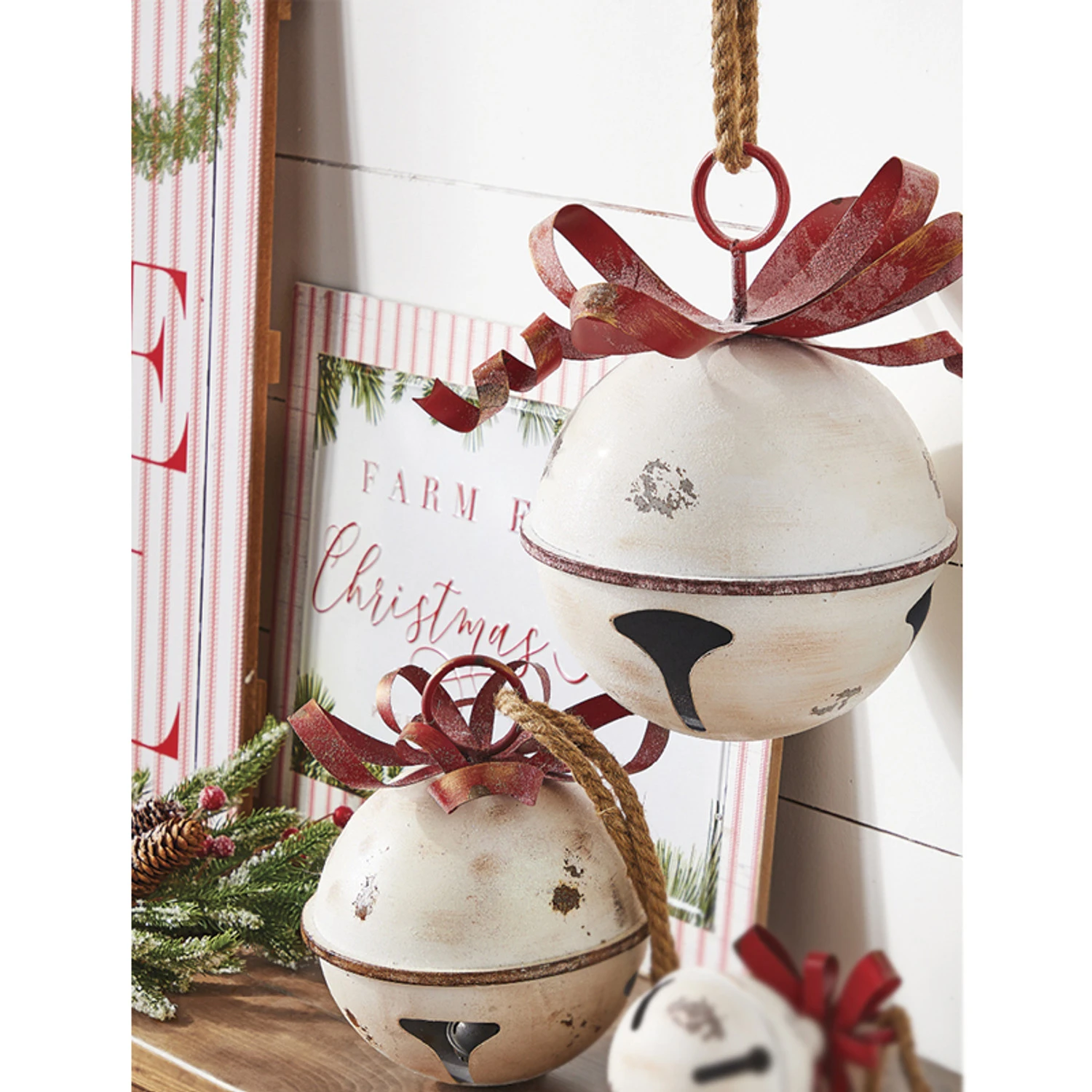 These rustic bell Christmas ornaments are perfect to hang on your covered porch, on the corner of your mantle, or even put them in your tree! Each one is a rustic white color with a red metal bow on the top! Each sold individually. Made by Raz Imports. Made of metal. Dimensions: 11″ or 13.5″. Item #: 4015935 or 4015934