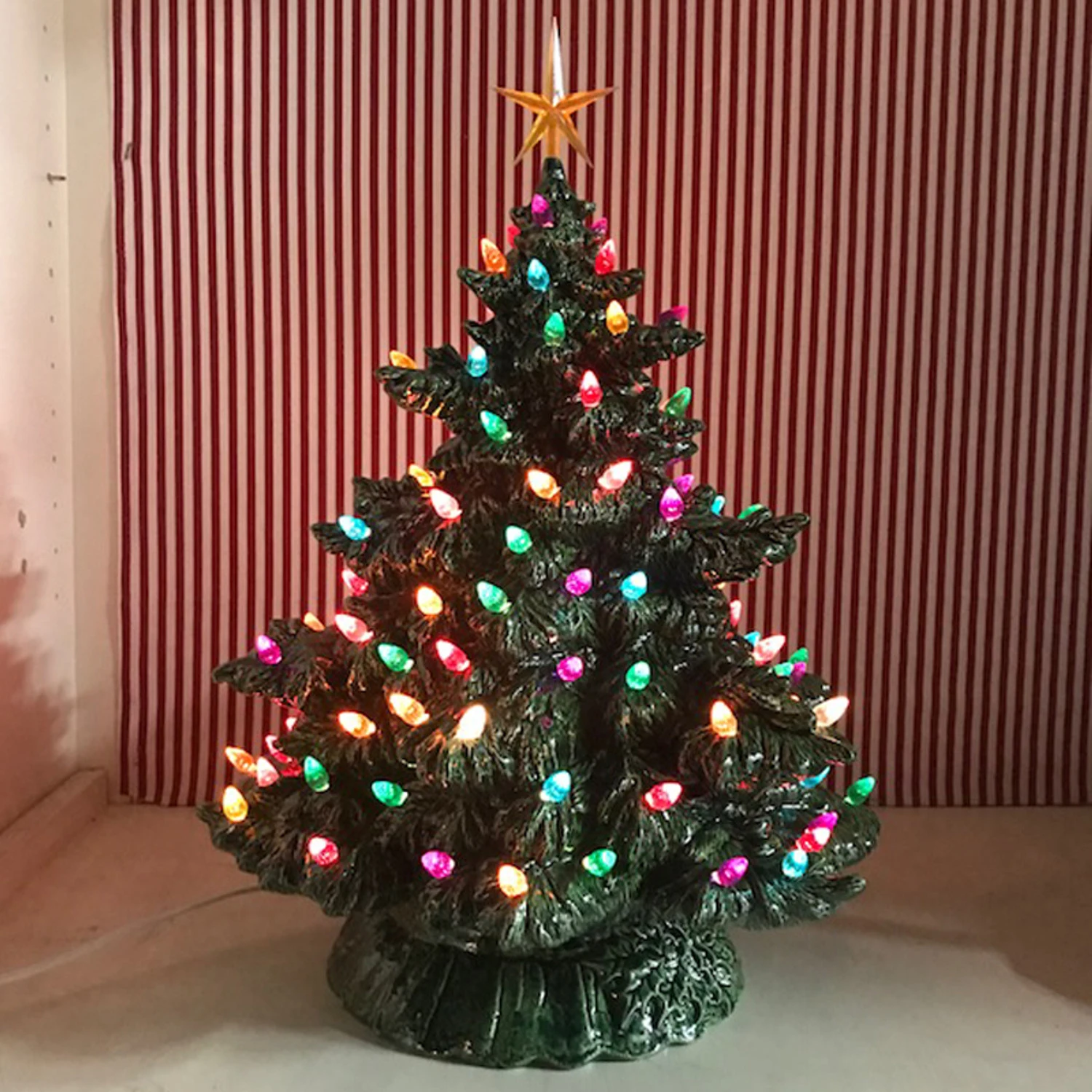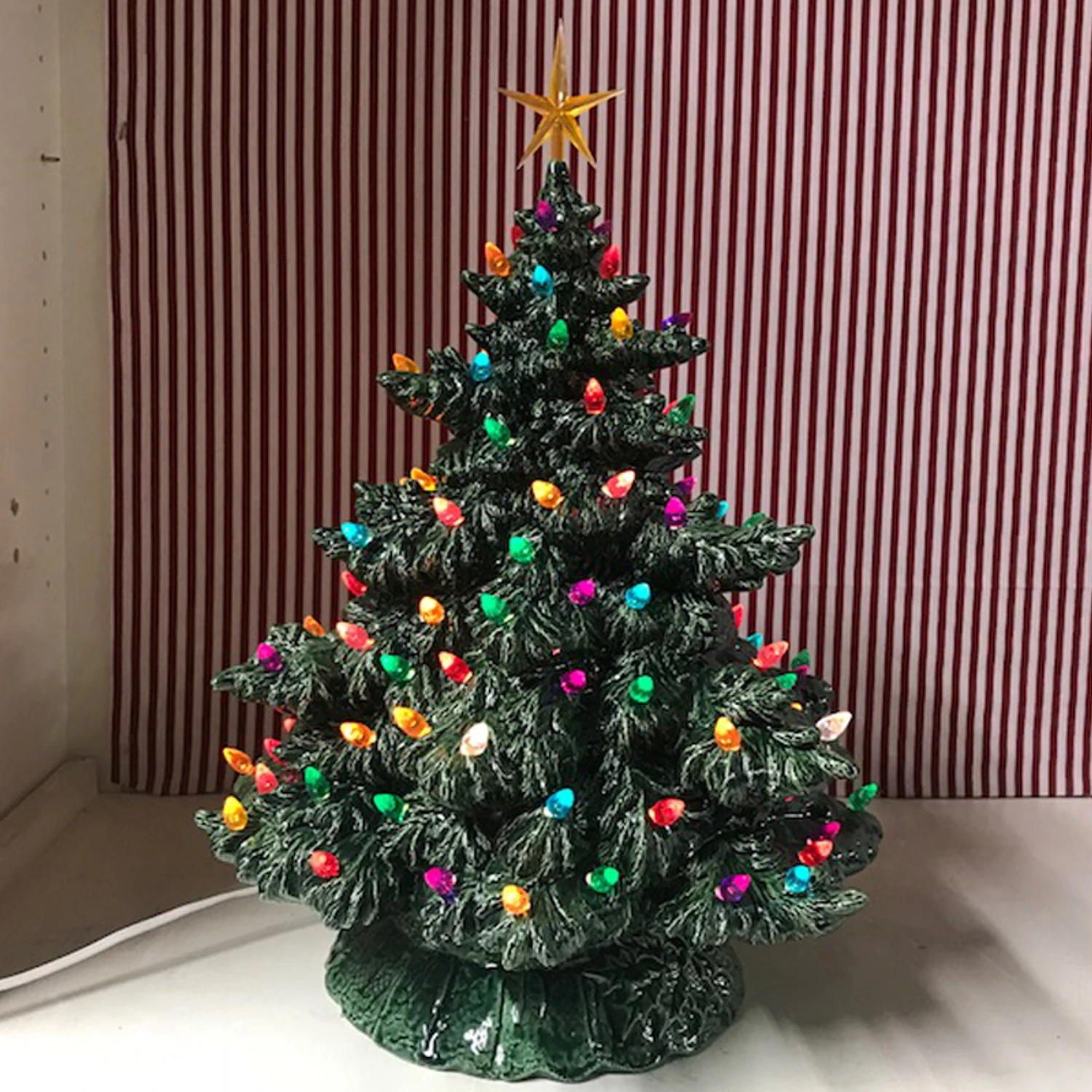 This Sierra lighted ceramic Christmas tree would look great on your table top, on a mantel or even in a guest room to bring Christmas cheer. Hand made by local artisans, this little tree is made from the original molds from the 1940’s. Includes: tree, base, interior light bulb, and Christmas color light bulbs. Dimensions: 16″ tall (with star) 14″ (without) and 13″ wide.